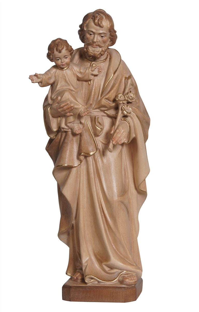 This is an awesome depiction of Saint Joseph holding the Infant Jesus carved in Maple wood and hand painted in oil colors. The realism of this figurine is truly stunning. The sculpture shows all classical features with complete follow through in detail. Absolutely breath-taking. This sculpture is hand carved in selected Maple wood and hand painted by professional artists. This Saint Joseph Statue is available in many sizes and finishes, including Figurine sizes; up to statue proportions.